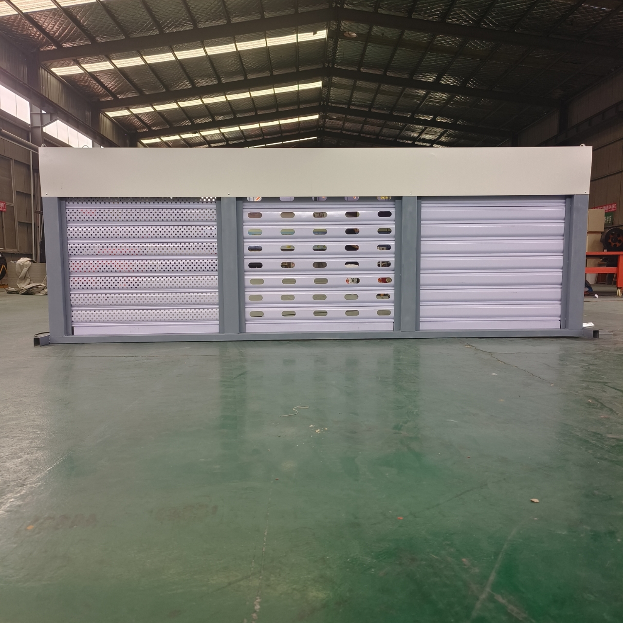 门体采用镀锌钢板、不锈钢板或彩钢板经冷轧成型,导轨内置抗风钩结构防止帘片脱轨。核心抗风强度达784.5Pa,可抵御12级台风,最大规格覆盖高12米、宽20米 。集成防撬、防尘、隔音、保温等复合功能,底部密封条与铝合金轨道增强耐用性。支持电动、手动及遥控操作,适配斜坡或转角场地安装,启闭速度为2-9米/分钟,电源适配220-380V/50Hz。相较于传统卷帘门,其抗风钩设计解决了帘片易吹脱、地槽易堵等问题。主要不足为制造成本较高且国内自主品牌较少